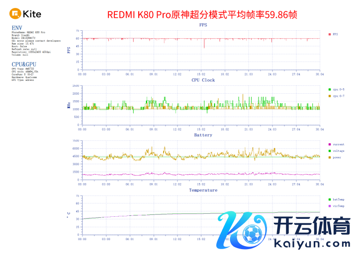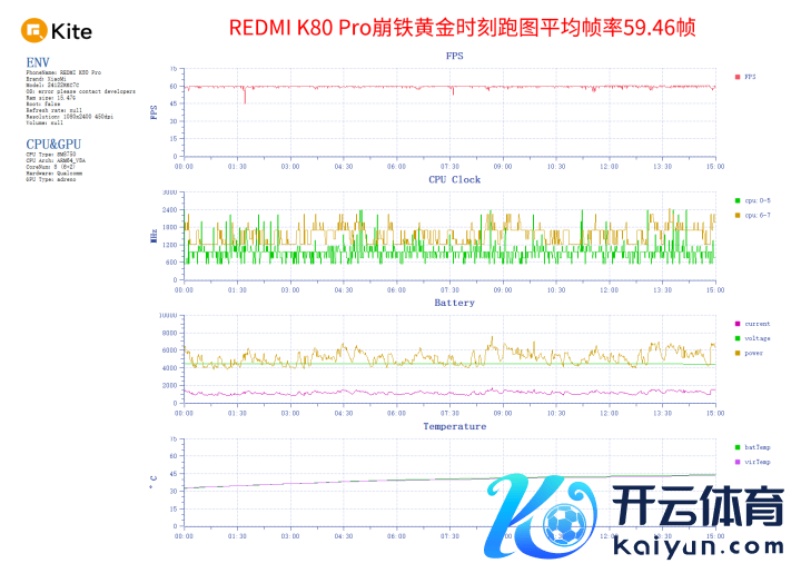 在游戏实战中,咱们平直来看崩铁的黄金技艺场景,该场景的秘籍更高,敌手机的性能压力更大。REDMI K80Pro测试平均帧率59.46帧,全程帧率比较稳,有波动情况但无法被视觉感知到。游戏平均功率5.13W,正面最高温42.5度,后头最高温43.7度。以该场景的高负载,这个发扬让咱们相配状态了。