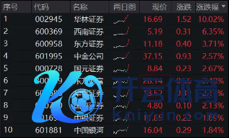 刚刚,券商板块异动拉升,个股集体走强,截止发稿,50只券商股超9成涨逾1%,华林证券涨停封板,西南证券涨逾6%,东方证券涨近4%,中金公司、东方金钱、华泰证券等涨幅居前。