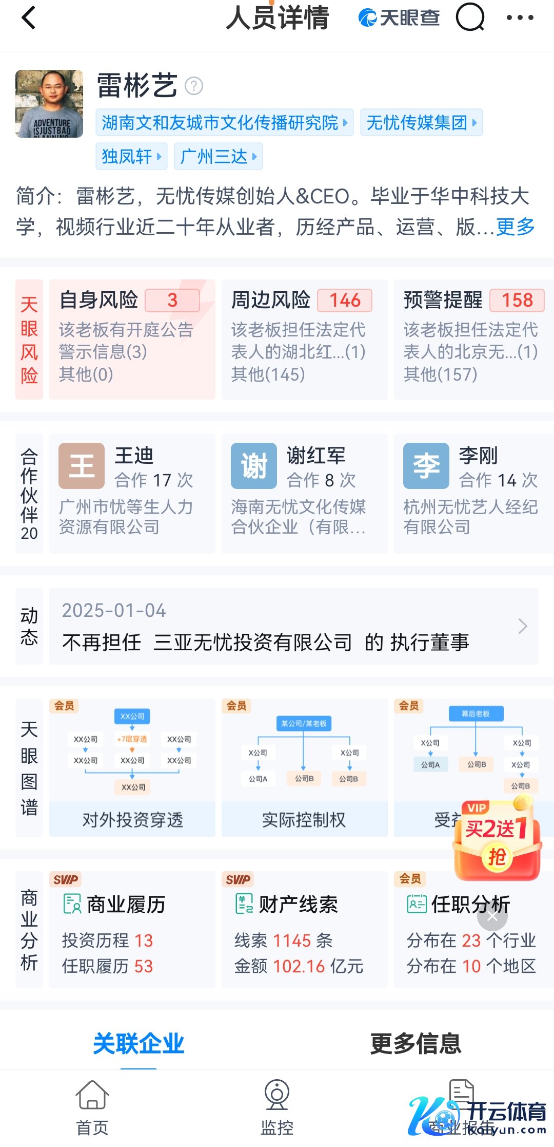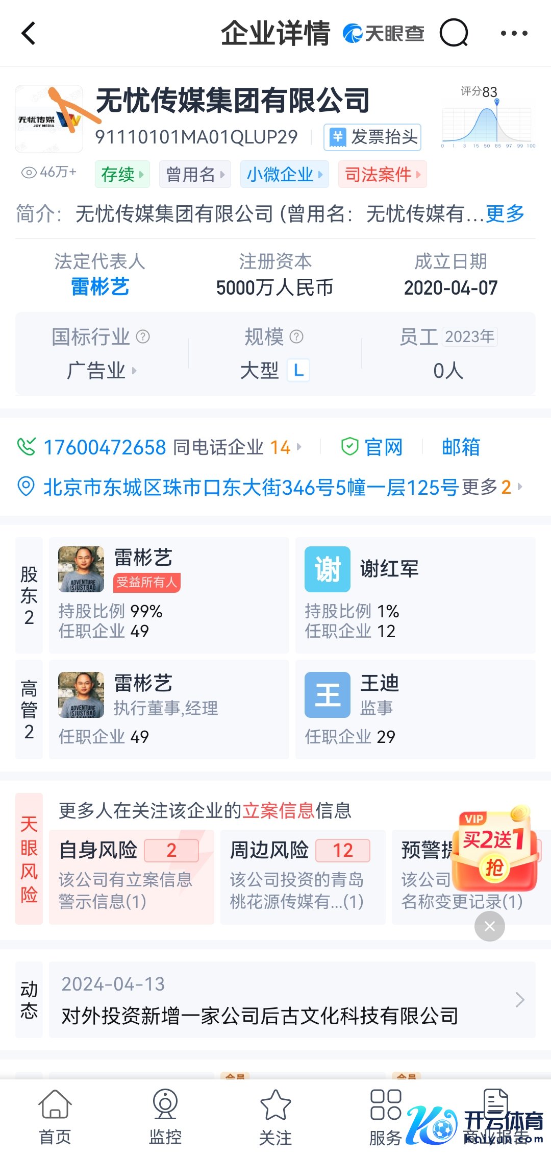 天眼查深远,无忧传媒最早的公司实体是湖南无忧文娱有限公司,成立于2016年,位于湖南省长沙市,是一家互联网型经纪公司,以从事文娱业为主的企业。公司注册成本1000万元,对外投资了多家企业。2020年起,其法定代表东说念主雷彬艺又前后注册了无忧传媒集团有限公司、杭州无忧传媒有限公司等。