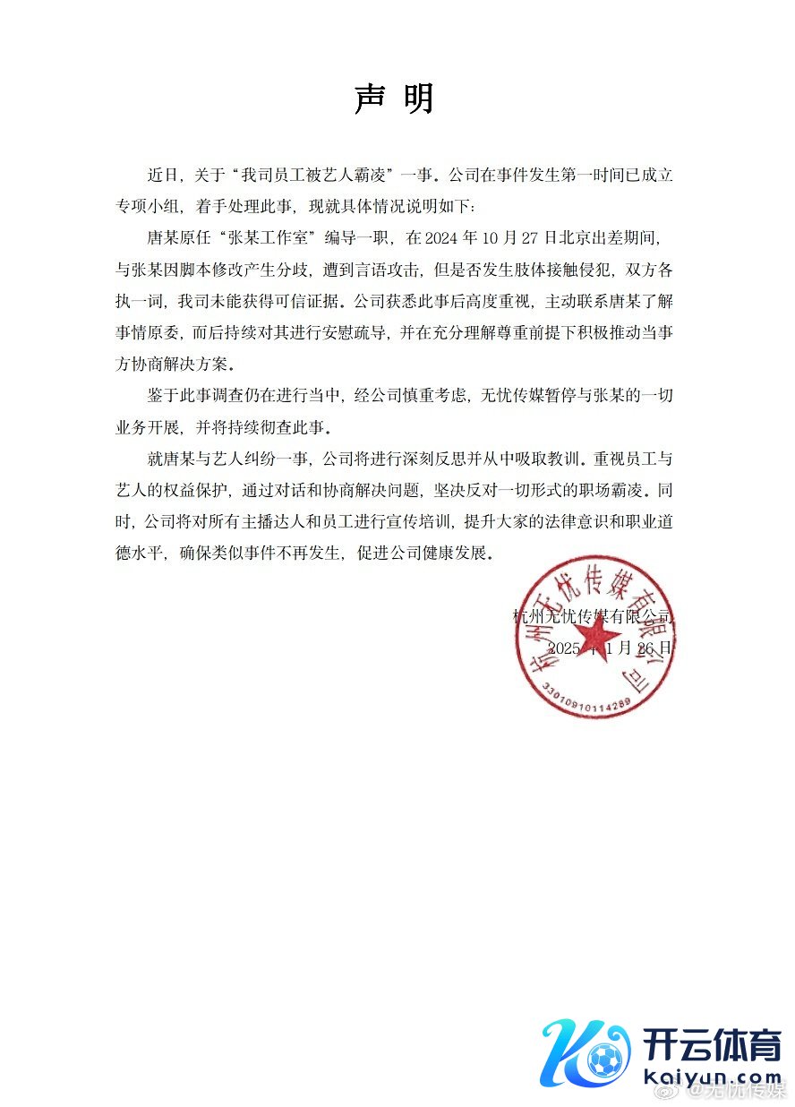 就唐某与艺东说念主纠纷一事,公司将进行深刻反念念并从中吸取教学。好奇职工与艺东说念主的权力保护,通过对话和协商科罚问题,刚烈反对一切体式的职场霸凌。同期,公司将对总共主播达东说念主和职工进行宣传培训,进步行家的法律富厚和作事说念德水平,确保雷共事件不再发生,促进公司健康发展。