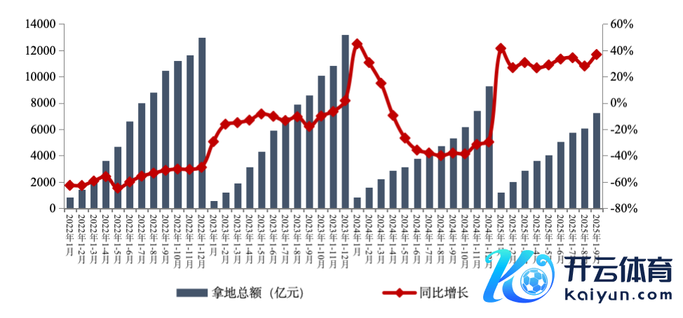 2022年1月-2025年9月TOP100房企累计拿地总数及同比情况图源:中指测度院