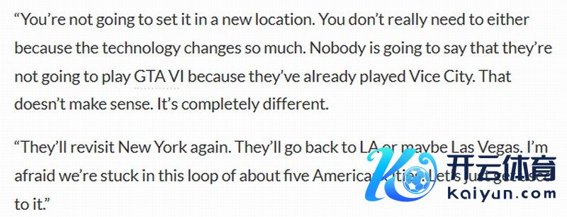 弗梅伊以为制作像《GTA》这么鸿沟浩大的游戏所需的成当场间越来越长,再加上它与“讥讽性”的好意思国城市文化相干在全部,这意味着该系列游戏异日不太可能再次探索巨匠城市。
