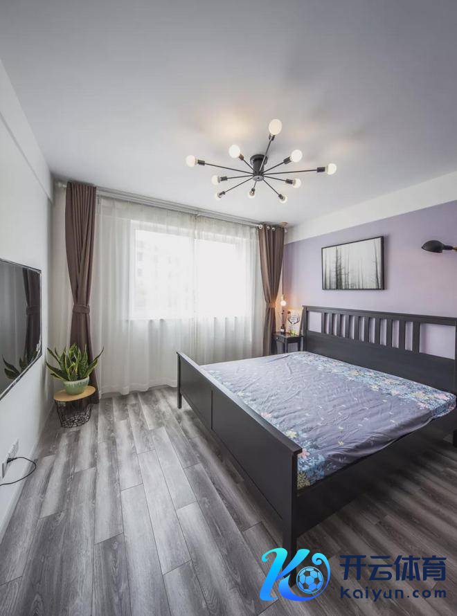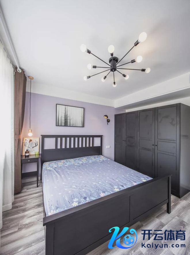 ▲卧室床头墙在浅紫色乳胶漆基础,挂上一副田地的丛林掩盖画,搭配玄色的床铺与衣柜,呈现出一个教训肃穆的氛围感。
