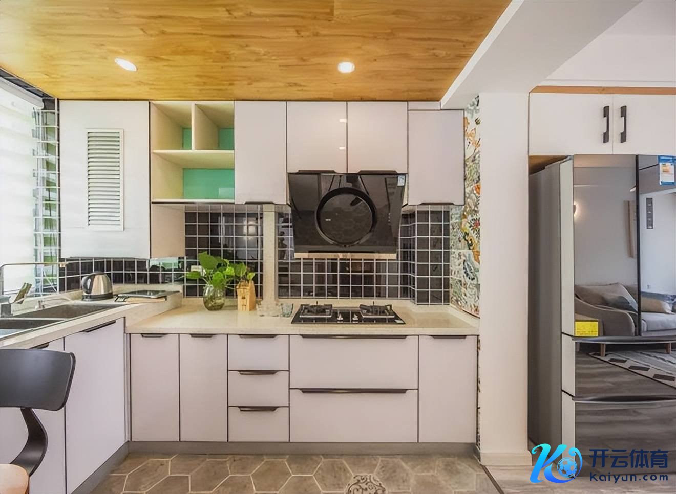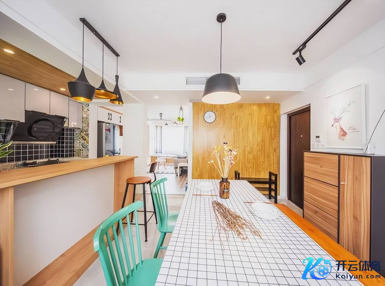 ▲绽放式的厨房与餐厅隔着一起小吧台,暖灰色六边砖大地+玄色小格纹砖墙面,天花举座木色吊平,装入筒灯,显得简陋大方好当然。