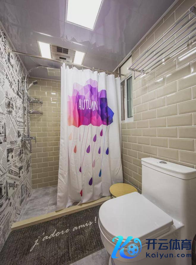 ▲卫浴区的墙面砖在暖灰色面包砖基础,装置花洒的这面墙则是以独到的报纸图案纹理的狡计云开体育,淋浴区外铺上空闲的地毯,最大化地保险居家空间的干湿辩认与安全。