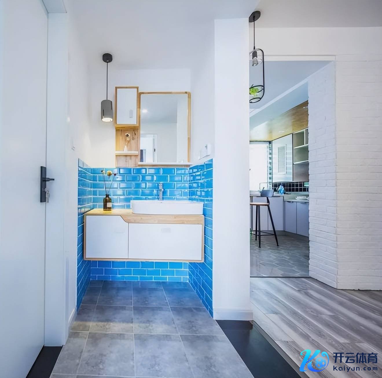 ▲洗手盆装在走廊区域,墙脚区域装着海蓝色的墙砖,壁挂洗手盆刚好镶嵌中间位置,紧凑的空间也哄骗得精炼大气。